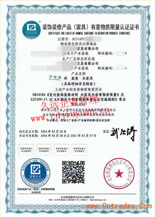 家具有害物質限量認證證書