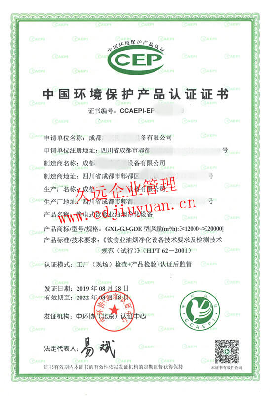 中國環境保護產品認證證書